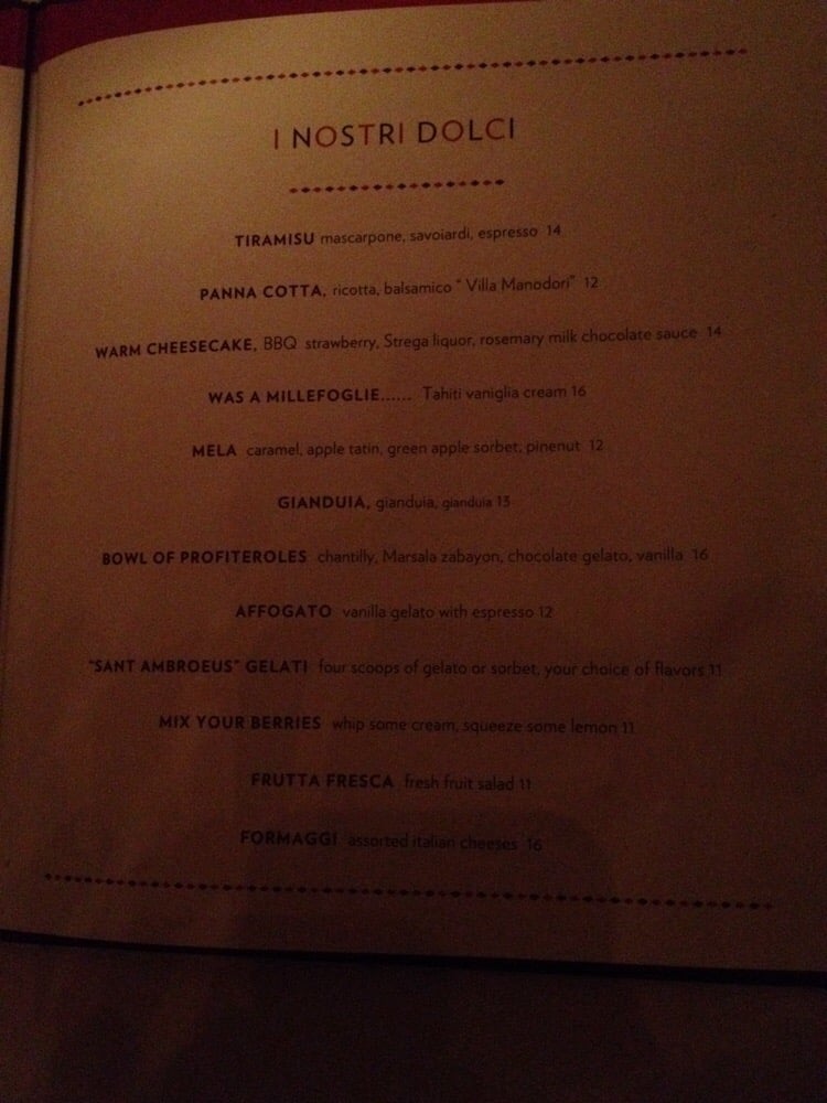 Mascarpone, mascarpone, savoiardi, espresso. Suggested Pairing: Tawny Port, Taylor Fladgate, 20 Years $22